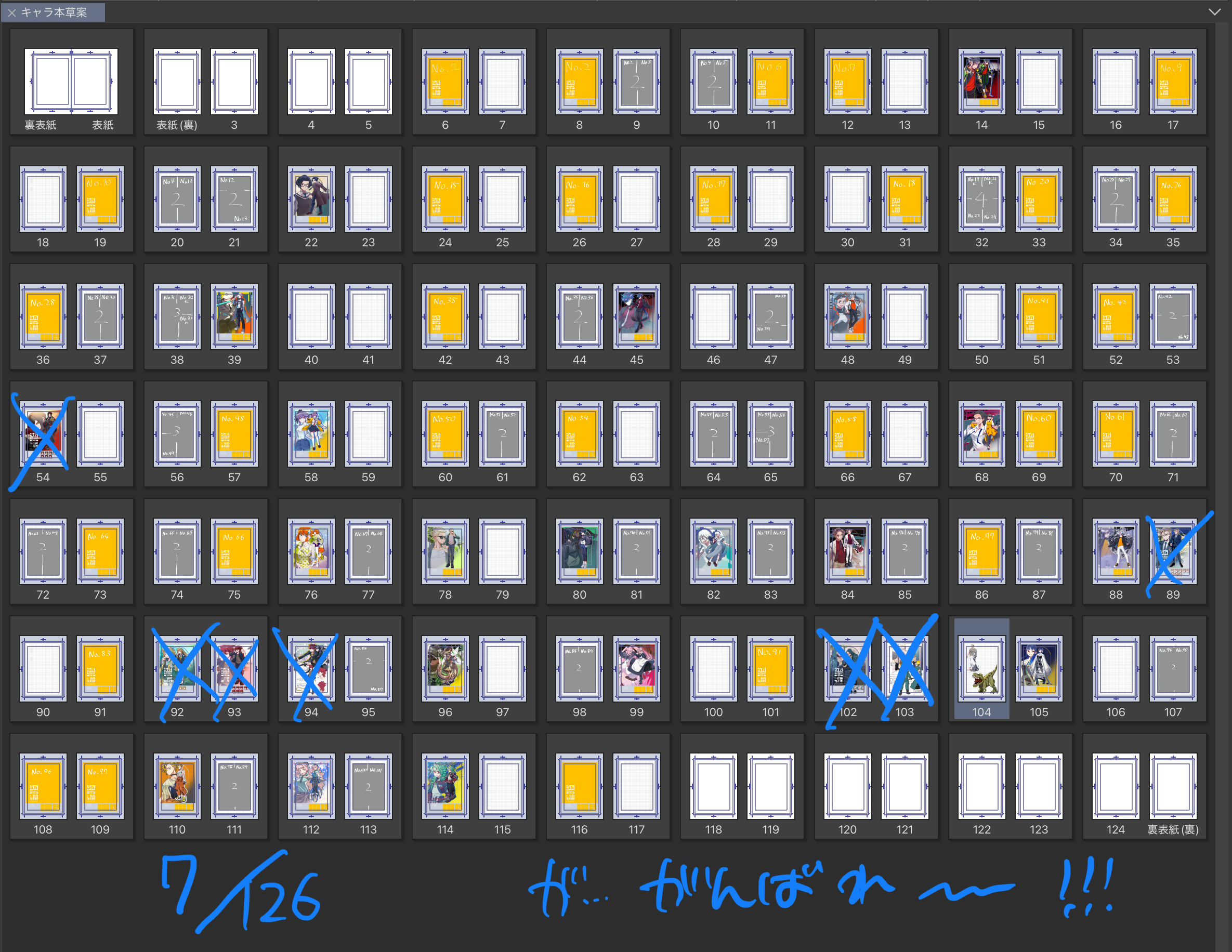 逆算してキャラデザ本進行フローどうなるかなって調べたんですよ。1週間に11P終わらせないとダメそう。