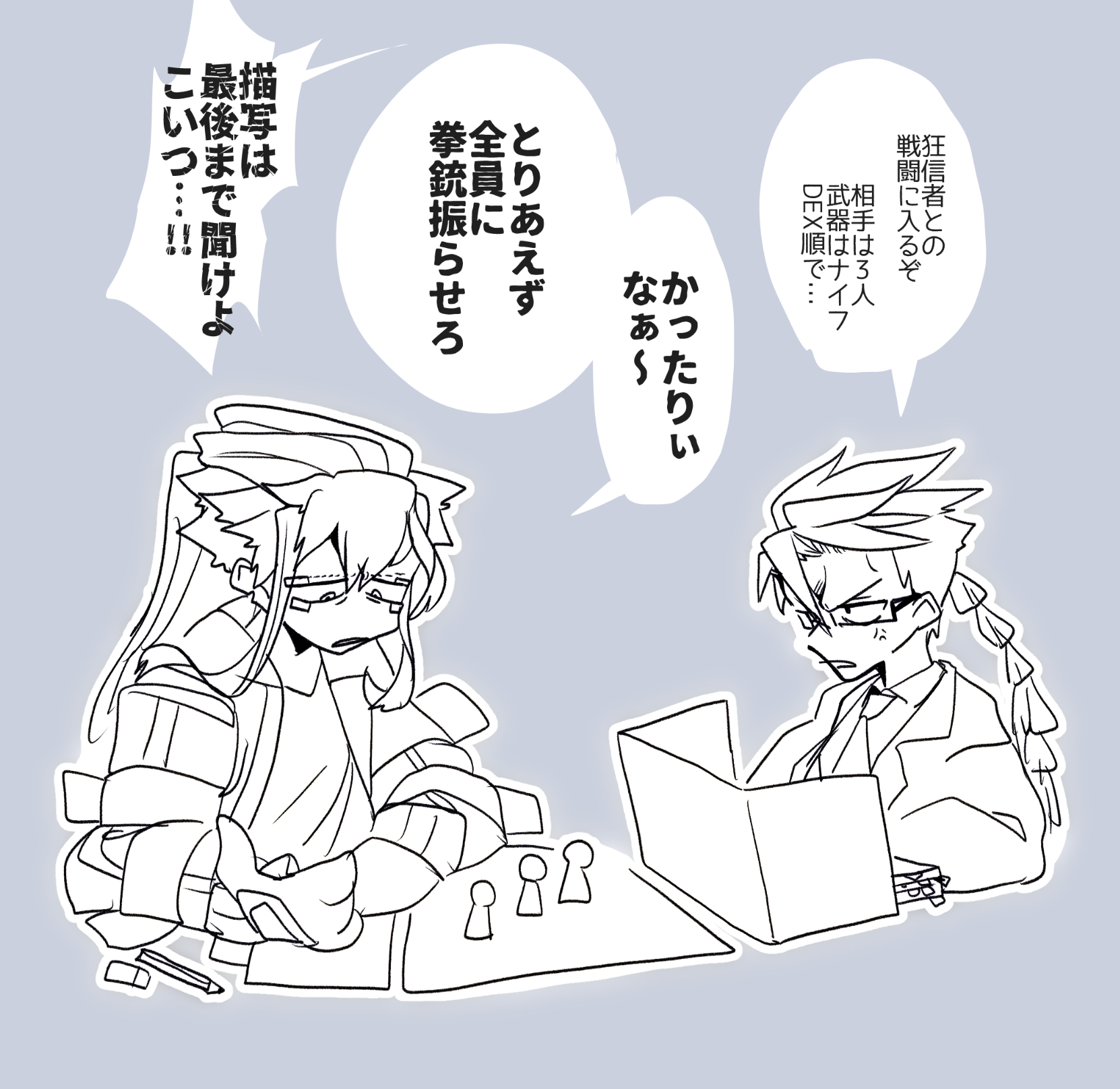 らくがき。KPをやるニ貝堂とTRPGをやる両角。仲悪そう。