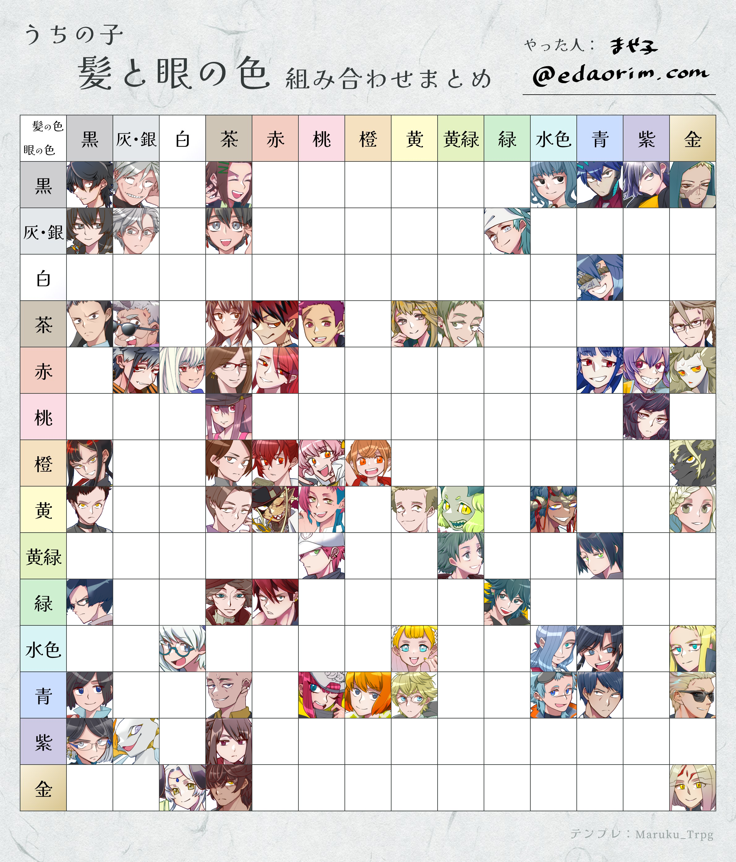 1686 髪と眼の色組み合わせテンプレ追加しました。 自分の中では重複してないつもりでも結構してた。おもしろい。意識して外れていかないと揃う様になってるのかもしれない。それぞれのデザイン振り返りしたい。 #TRPG 絵 2025/07/14(Mon)